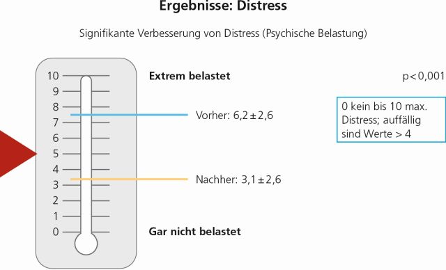 Der DCS-Score verbesserte sich von 37,5 ± 23,7 auf 20,1 ± 15,7 (p < 0,001). Hierbei sind Werte > 37,5 als ein „Aufschieben von Entscheidungen/Unsicherheit“ und Werte < 25 mit einer „Umsetzung von Entscheidungen“ assoziiert. Das Distress-Thermometer zeigte ebenfalls eine Verbesserung von 6,2 ± 2,6 auf 3,1 ± 2,6 (p < 0,001) (▶ Abb. 1). Hierbei reicht die Skala von 0 „kein“ bis 10 „maximaler Distress“, Werte > 4 werden als auffällig interpretiert. Auch beim Wissen der Patienten konnten wir bei fünf Fragen eine Verbesserung von 2,3 richtigen Antworten auf drei richtige Antworten nachweisen.